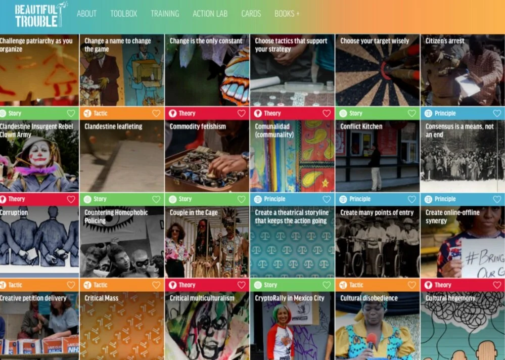 Beautiful Trouble is a book, card deck, web toolbox, creative campaign incubator, and international network of artist-activist-trainers helping grassroots movements be more creative, effective, and irresistible.